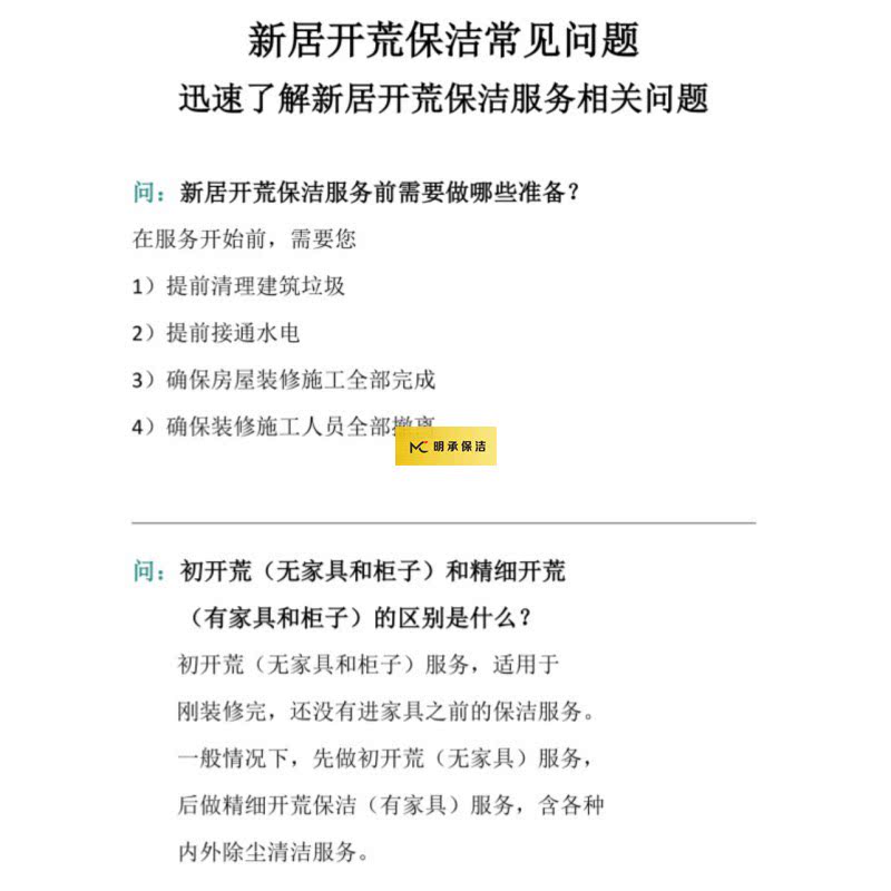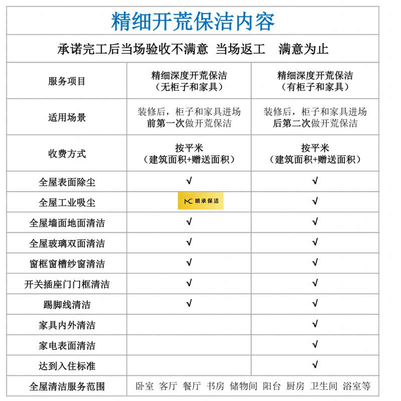 明承保洁主营: 工程开荒 外墙清洗 空调清洗 玻璃清洗 地毯/地面清洗 精细开荒保洁 瓷砖美缝 石材翻新 地下车库保洁清洗 新房开荒保洁 全屋深度保洁 别墅保洁 商铺/办公楼保洁 工厂保洁 学校保洁 地板打蜡 会所保洁 展会保洁 楼宇保洁 轮船保洁 公司保洁 厂房保洁 保洁阿姨外包 日常保洁 办公椅子沙发软装清洗等